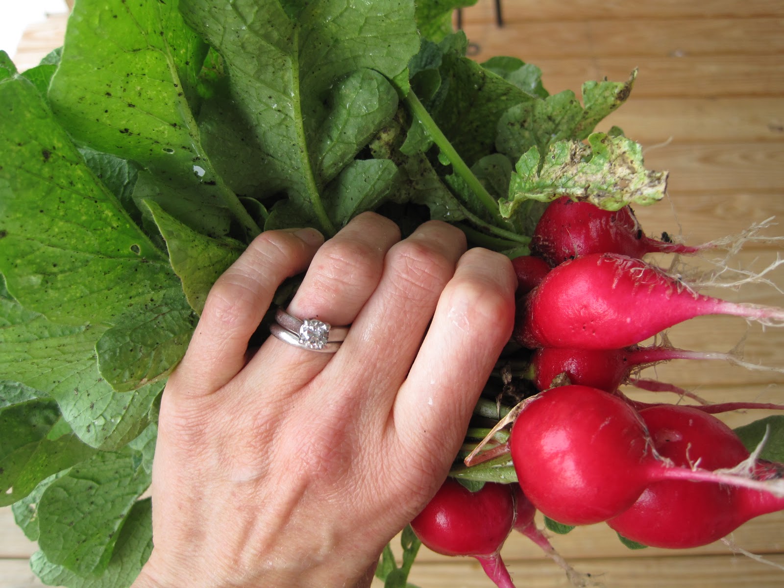 It's the top of a bunch of radishes. Although radishes are fun to pull (we love pulling root vegetables around here), we're not really fans of consuming very many. So we ate a few, gave away some and then treated the goats with the rest. The color is beautiful though!